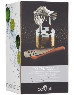 Containing everything you need to get started making delicious cocktails, this brass finish stainless steel cocktail set includes a cocktail strainer, bar tongs, wooden handle double jigger and a wooden muddler! All held together neatly in a hammered brass finish stand. The perfect gift for any cocktail connoisseur.