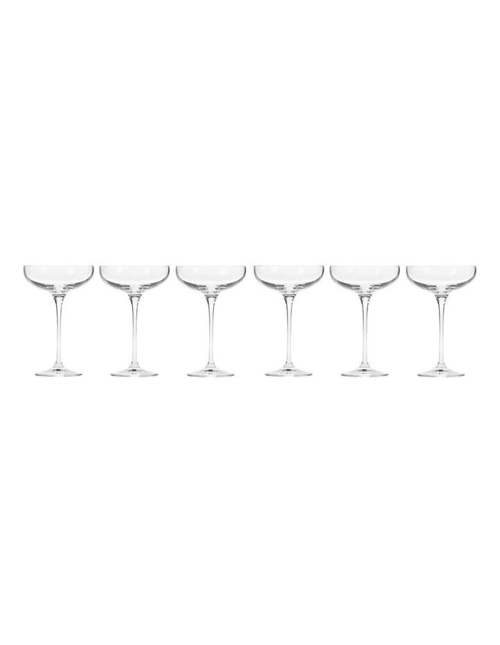Made in Poland, these vintage-inspired champagne coupe glasses are an elegant alternative to traditional flutes. Gift boxed set of six. Dishwasher safe.