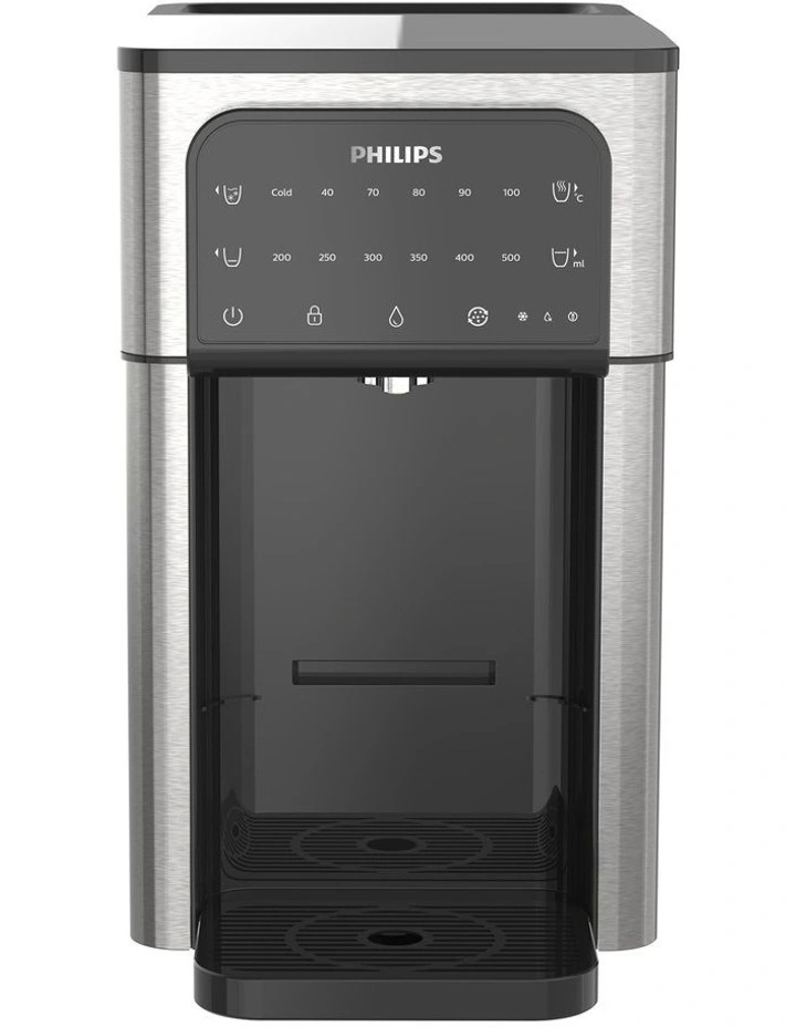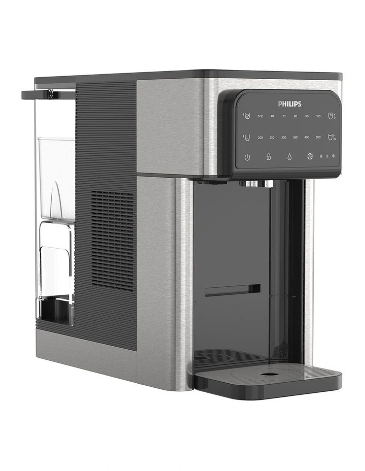 6 pre-set temperatures : cold, 40C, 70C, 80C, 90C, 100C 6 pre-set dispensing volumes : 200, 250, 300, 350, 400, 500ml Usage-based filter lifetime monitoring Safety lock to prevent hot water burns 2.8L easy-filled water tank Plug and play, no installation required Adjustable drip tray Replacement filter packs: AWP211/79 (3 pack) or AWP212/79 (6 pack)